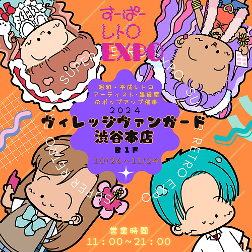 すーぱーレトロEXPO in ヴィレッジヴァンガード渋谷本店 すーぱーレトロEXPO in ヴィレッジヴァンガード渋谷本店 2024年10月26日(土)~11月24日(日) 11:00~21:00 ヴィレッジヴァンガード渋谷本店 B1F →12月25日まで会期が延長されました 今回ははじめてのヴィレッジヴァンガード様での開催です。 大好きなお店でのイベントに参加することができてうれしいです! ぜひお立ち寄りいただけると幸いです。 イベント詳細については、公式サイトをご確認ください。 www.superretroexpo.club催事 | すーぱーレトロEXPOinヴィレッジバンガード渋谷本店2024ヴィレッジバンガード渋谷本店さんでポップアップショップを開催します!ネオレトロアーティストとガチレトロ雑貨店のイベントです!