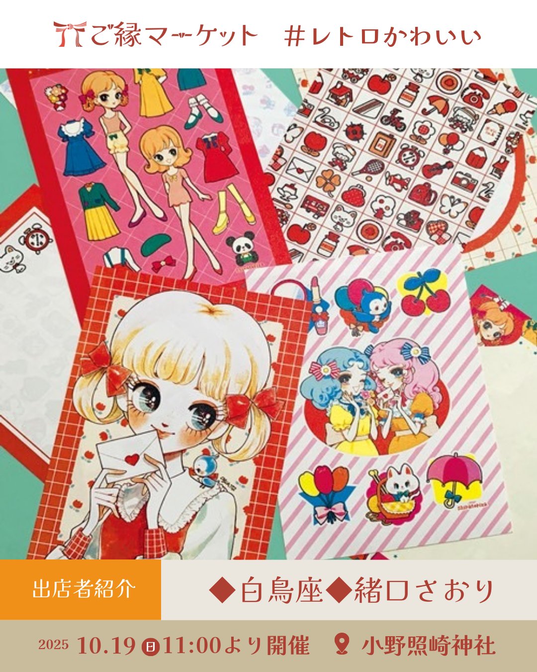 「雑貨・アクセサリー・アート・イラスト・服」を神社の境内で展示・販売するイベントです。